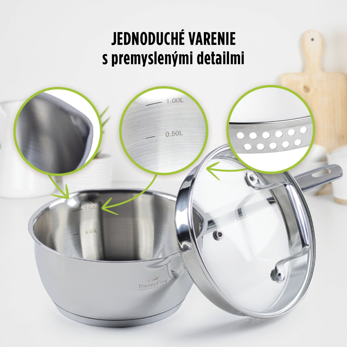 Trojvrstvové dno pre odolnosť a technológia ThermoFlow pre vynikajúcu distribúciu tepla.