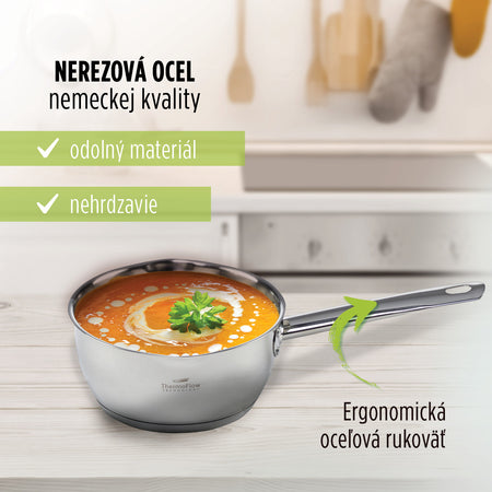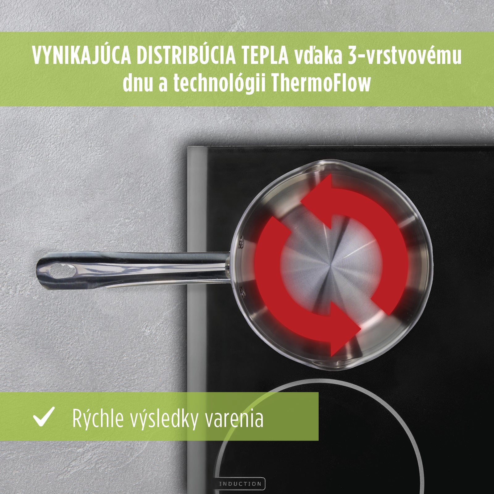 Špičkový riad z nehrdzavejúcej ocele 18/10 s 3-vrstvovým nárazovým dnom pre rýchly ohrev a rovnomerné varenie. Silná vrstva prvotriednej nehrdzavejúcej ocele nemeckej kvality, hliníkové jadro pre dobrú tepelnú vodivosť a vonkajšia vrstva z nehrdzavejúcej ocele zaručujú trvanlivosť, odolnosť a efektívne varenie. Technológia ThermoFlow zabezpečuje rovnomerné rozloženie tepla po celom povrchu riadu, takže oceľový rám riadu sa správne zahrieva a umožňuje rýchle a mimoriadne účinné varenie.
