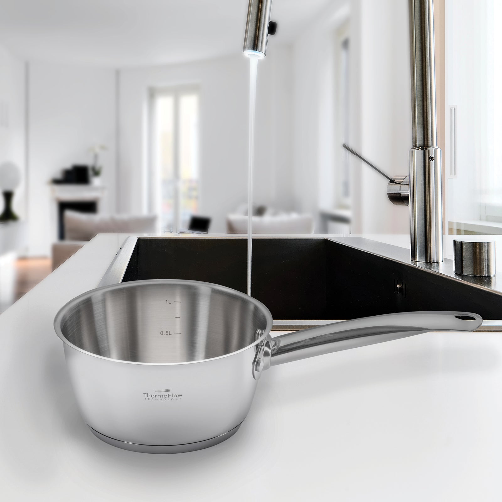 Oceľová rajnica Pour&Cook II so sklenenou pokrievkou s priemerom 16 cm a objemom 1,2 L je vyrobená z nezničiteľnej ocele 18/10 s 3-vrstvovým dnom, ktoré umožňuje rýchly a rovnomerný ohrev a kratší čas varenia. Technológia ThermoFlow zaisťuje vynikajúce rozloženie tepla po celom povrchu riadu, čím sa zabezpečí rovnomerné varenie. Na jednoduchšie varenie má hrniec vo vnútri odmernú stupnicu, výlevku na ľahšie vylievanie a odparovanie, prispôsobenú pokrievku a okraj smerujúci von. Je vhodný na všetky varné dosky vrátane indukcie. Ľahko sa čistí, pretože je vhodná aj do umývačky riadu.