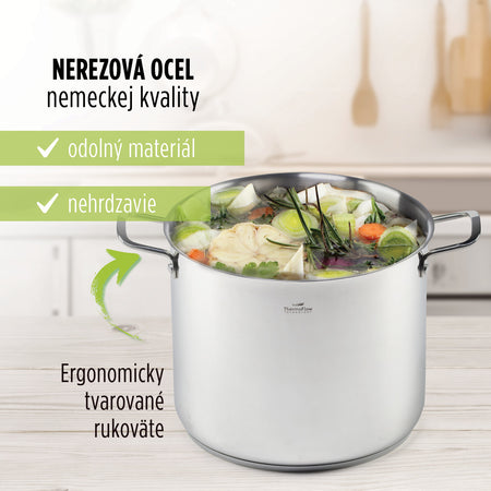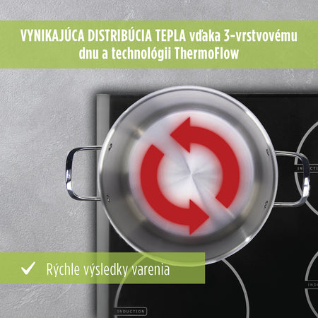 Špičkový riad z nehrdzavejúcej ocele 18/10 s 3-vrstvovým nárazovým dnom pre rýchly ohrev a rovnomerné varenie. Silná vrstva prvotriednej nehrdzavejúcej ocele nemeckej kvality, hliníkové jadro pre dobrú tepelnú vodivosť a vonkajšia vrstva z nehrdzavejúcej ocele zaručujú trvanlivosť, odolnosť a efektívne varenie. Technológia ThermoFlow zabezpečuje rovnomerné rozloženie tepla po celom povrchu riadu, takže oceľový rám riadu sa správne zahrieva a umožňuje rýchle a mimoriadne účinné varenie.