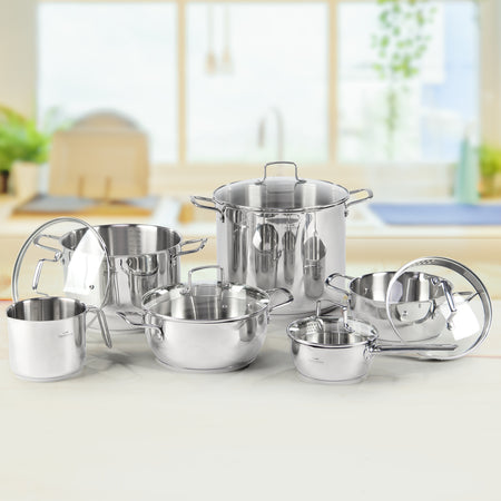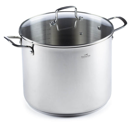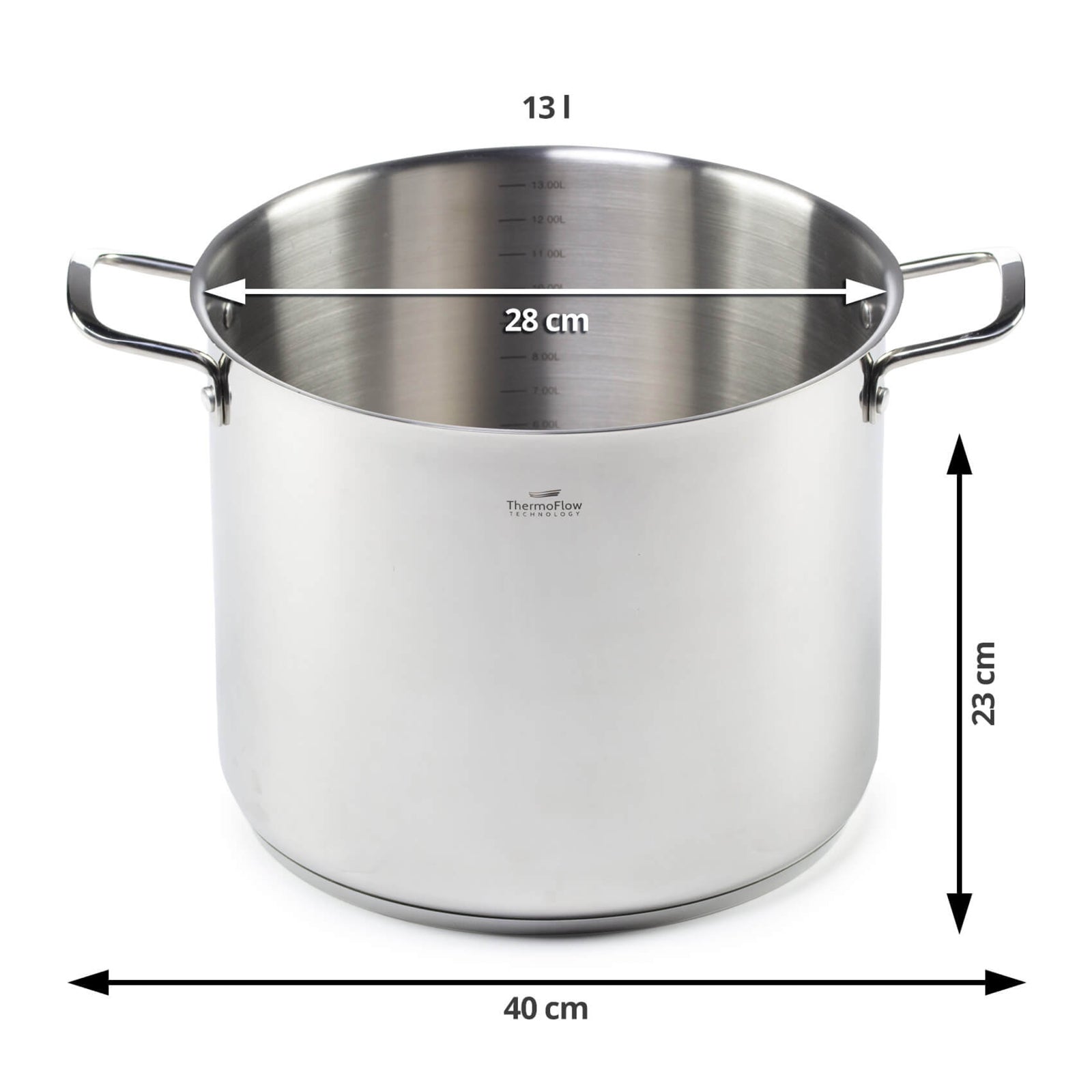 Oceľový hrniec Pour&Cook II so sklenenou pokrievkou s priemerom 28 cm a objemom 14 L je vyrobený z nezničiteľnej ocele 18/10 s 3-vrstvovým dnom pre rýchly a rovnomerný ohrev a kratší čas varenia. Technológia ThermoFlow zaisťuje vynikajúce rozloženie tepla po celom povrchu hrnca, čím sa zabezpečí rovnomerné varenie. Hrniec má vo vnútri odmernú stupnicu na jednoduchšie varenie, výlevku, špeciálne navrhnutú pokrievku a okraj smerujúci von na ľahšie vylievanie a odparovanie. Je vhodný na všetky varné dosky vrátane indukcie. Ľahko sa čistí, pretože je vhodný aj do umývačky riadu.