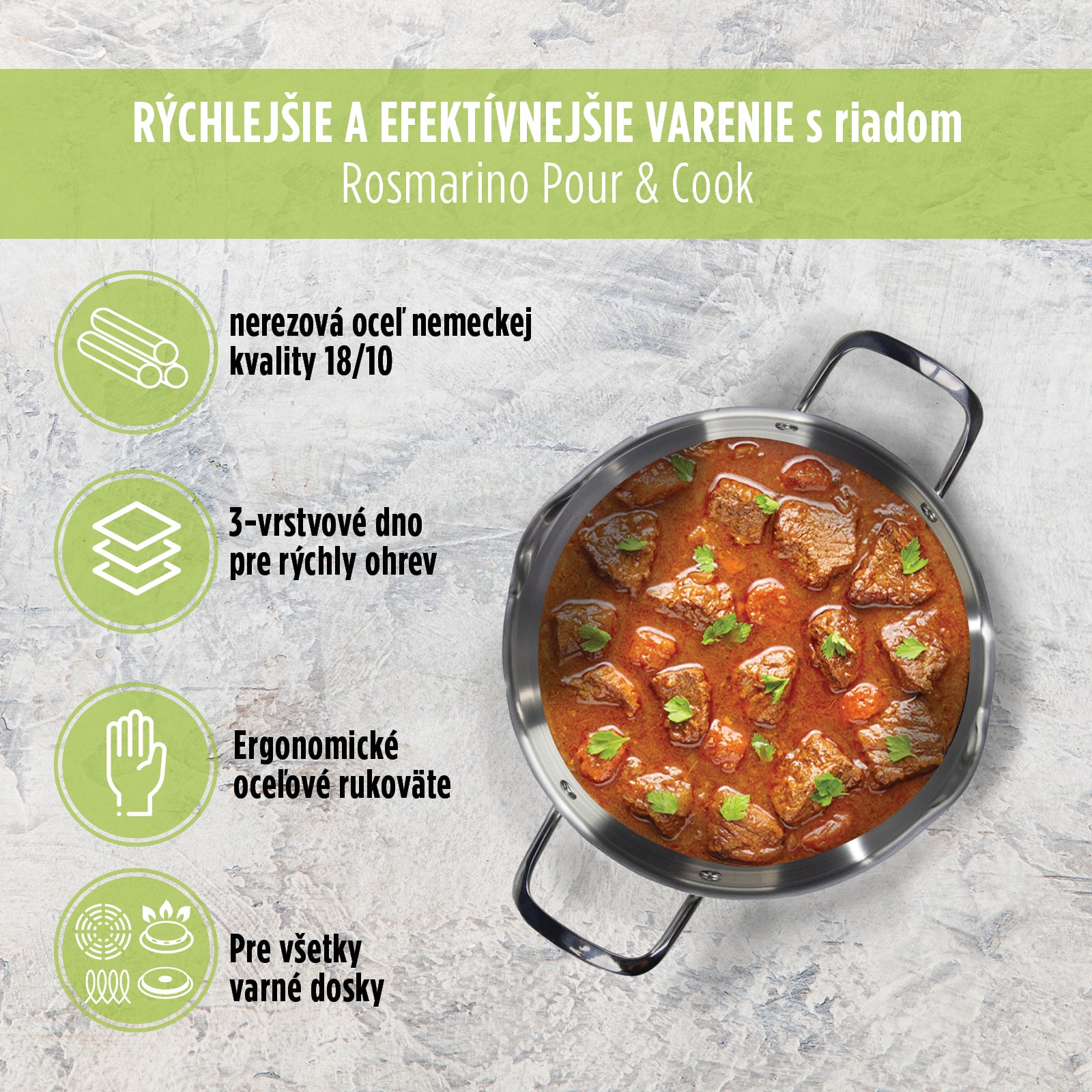 - Vhodný na všetky varné dosky vrátane indukcie.