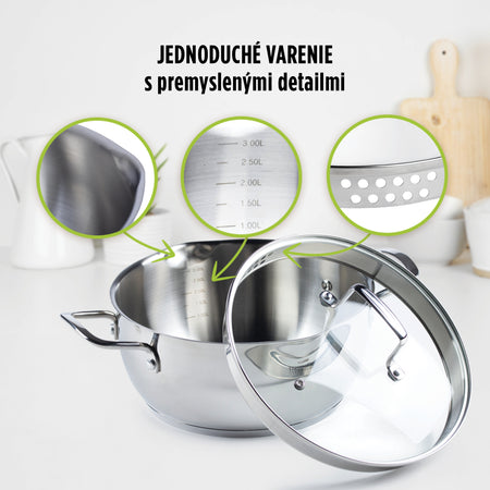 - Hrniec s priemerom 24 cm vyrobený z nehrdzavejúcej ocele 18/10 so sklenenou pokrievkou.