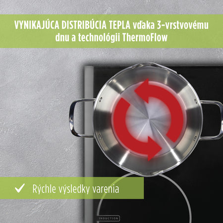 Špičkový riad z nehrdzavejúcej ocele 18/10 s 3-vrstvovým nárazovým dnom pre rýchly ohrev a rovnomerné varenie. Silná vrstva prvotriednej nehrdzavejúcej ocele nemeckej kvality, hliníkové jadro pre dobrú tepelnú vodivosť a vonkajšia vrstva z nehrdzavejúcej ocele zaručujú trvanlivosť, odolnosť a efektívne varenie. Technológia ThermoFlow zabezpečuje rovnomerné rozloženie tepla po celom povrchu riadu, takže oceľový rám riadu sa správne zahrieva a umožňuje rýchle a mimoriadne účinné varenie.