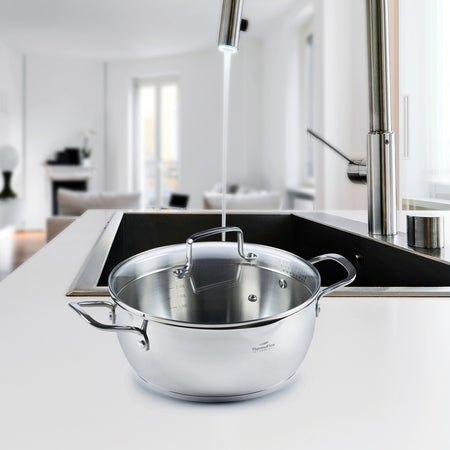 Oceľový hrniec Pour&Cook II so sklenenou pokrievkou s priemerom 24 cm a objemom 4,2 L je vyrobený z nezničiteľnej ocele 18/10 s 3-vrstvovým dnom pre rýchly a rovnomerný ohrev a kratší čas varenia. Technológia ThermoFlow zaisťuje vynikajúce rozloženie tepla po celom povrchu hrnca, čím sa zabezpečí rovnomerné varenie. Hrniec má vo vnútri odmernú stupnicu na jednoduchšie varenie, výlevku, špeciálne navrhnutú pokrievku a okraj smerujúci von na ľahšie vylievanie a odparovanie. Je vhodný na všetky varné dosky vrátane indukcie. Ľahko sa čistí, pretože je vhodný aj do umývačky riadu.
