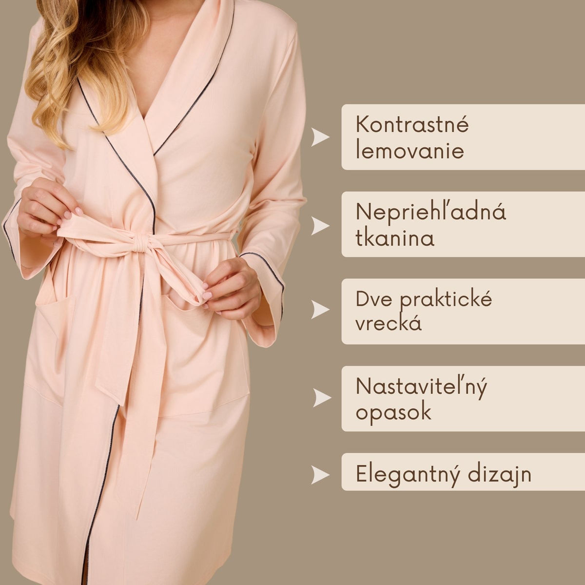- Prepracované kontrastné lemy pre nádych tichého luxusu