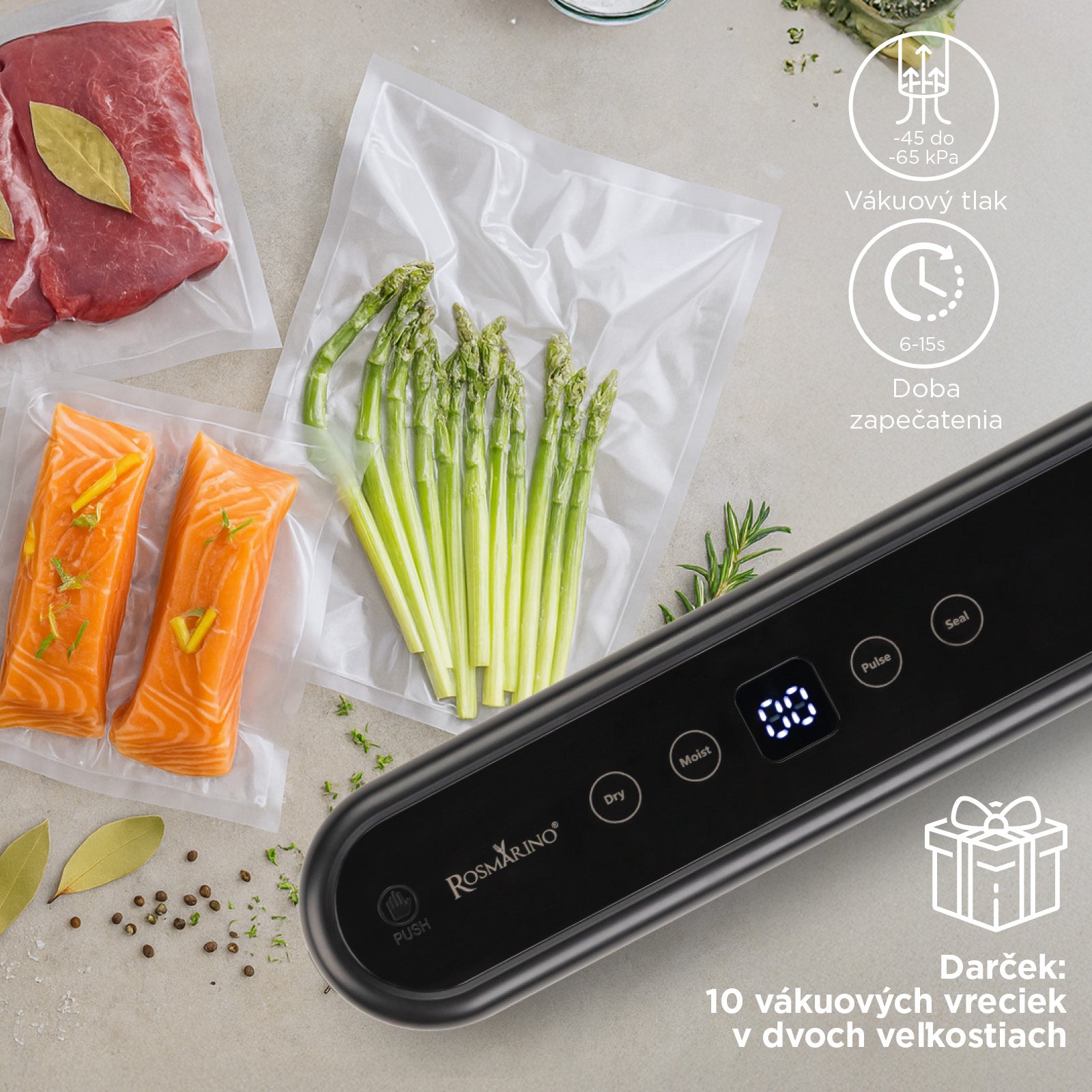 - Darček: 10 vákuovacích vreciek v dvoch veľkostiach – pre okamžité použitie.