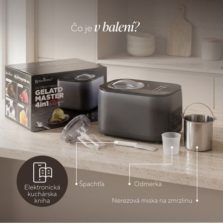 - Obsahuje príslušenstvo: nerezová nádoba na zmrzlinu, stierka, odmerka a e-receptár