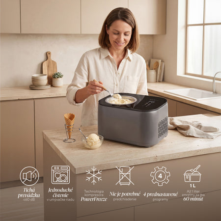 - PowerFreeze kompresorová technológia na výrobu zmrzliny bez predmrazovania nádoby alebo chladenia surovín