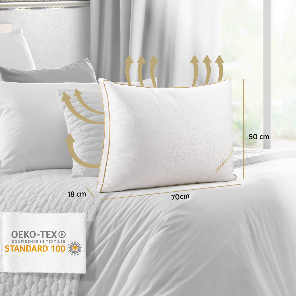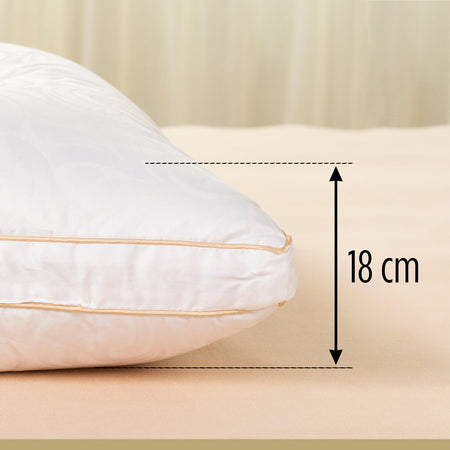 Vyšší hodvábny vankúš Victoria's Silk vám ponúka luxusné pohodlie pre každú minútu vašich nocí. S najjemnejším hodvábom na svete - morušovým hodvábom, ktorý sa prirodzene prispôsobuje zmenám teploty a je priedušný. Vyšší vankúš je ideálnou voľbou pre tých, ktorí radi spia na boku alebo na chrbte, alebo pre ľudí so širšími ramenami. Luxusná výplň poskytuje vynikajúcu podporu pre krčné stavce, takže sa môžete prebúdzať s väčšou energiou a rozlúčiť sa s bolesťami krku.