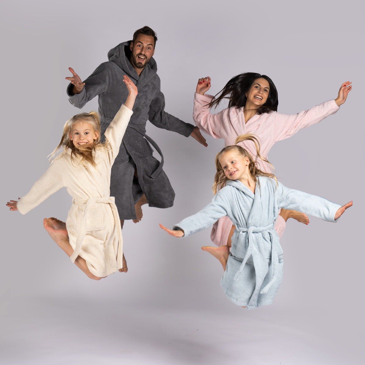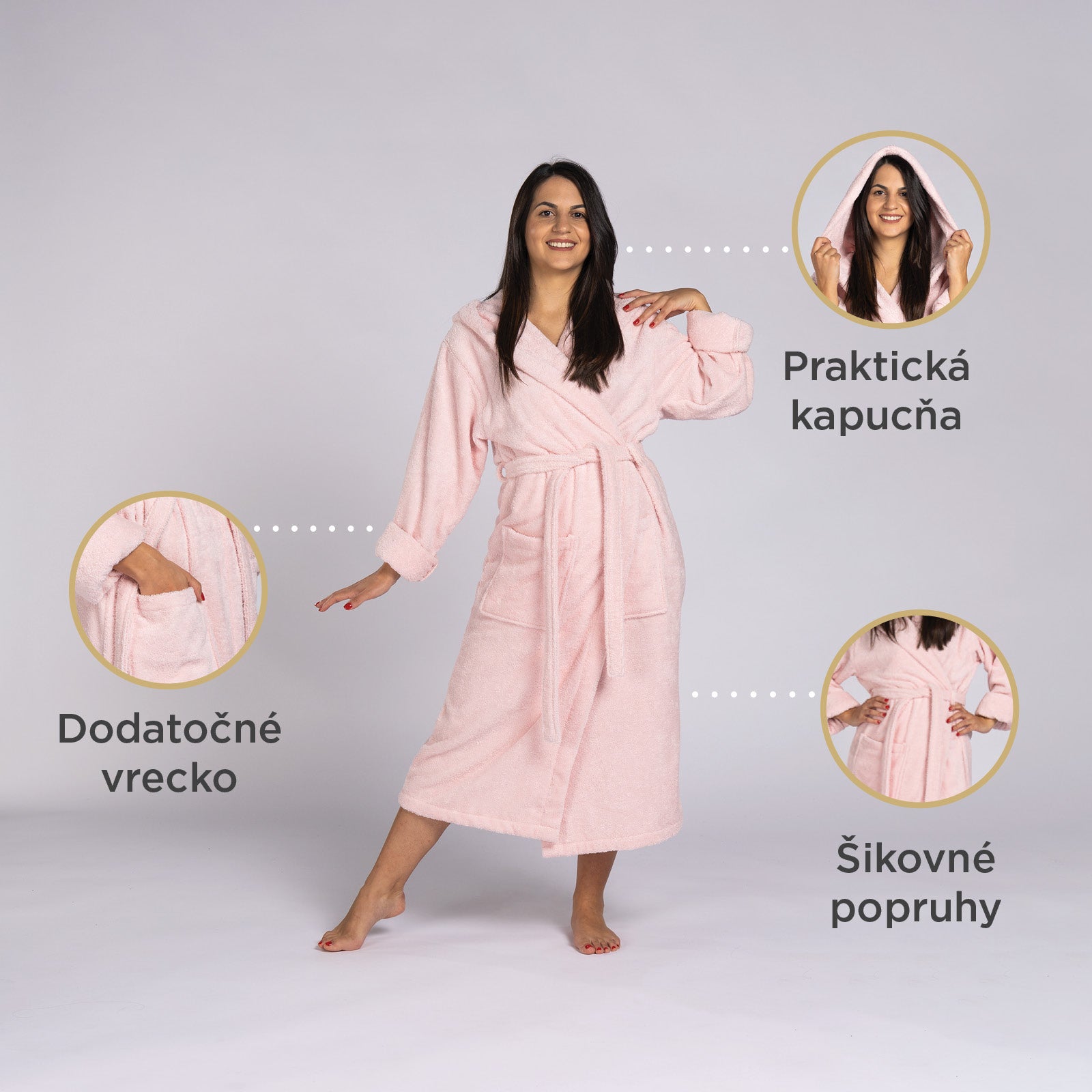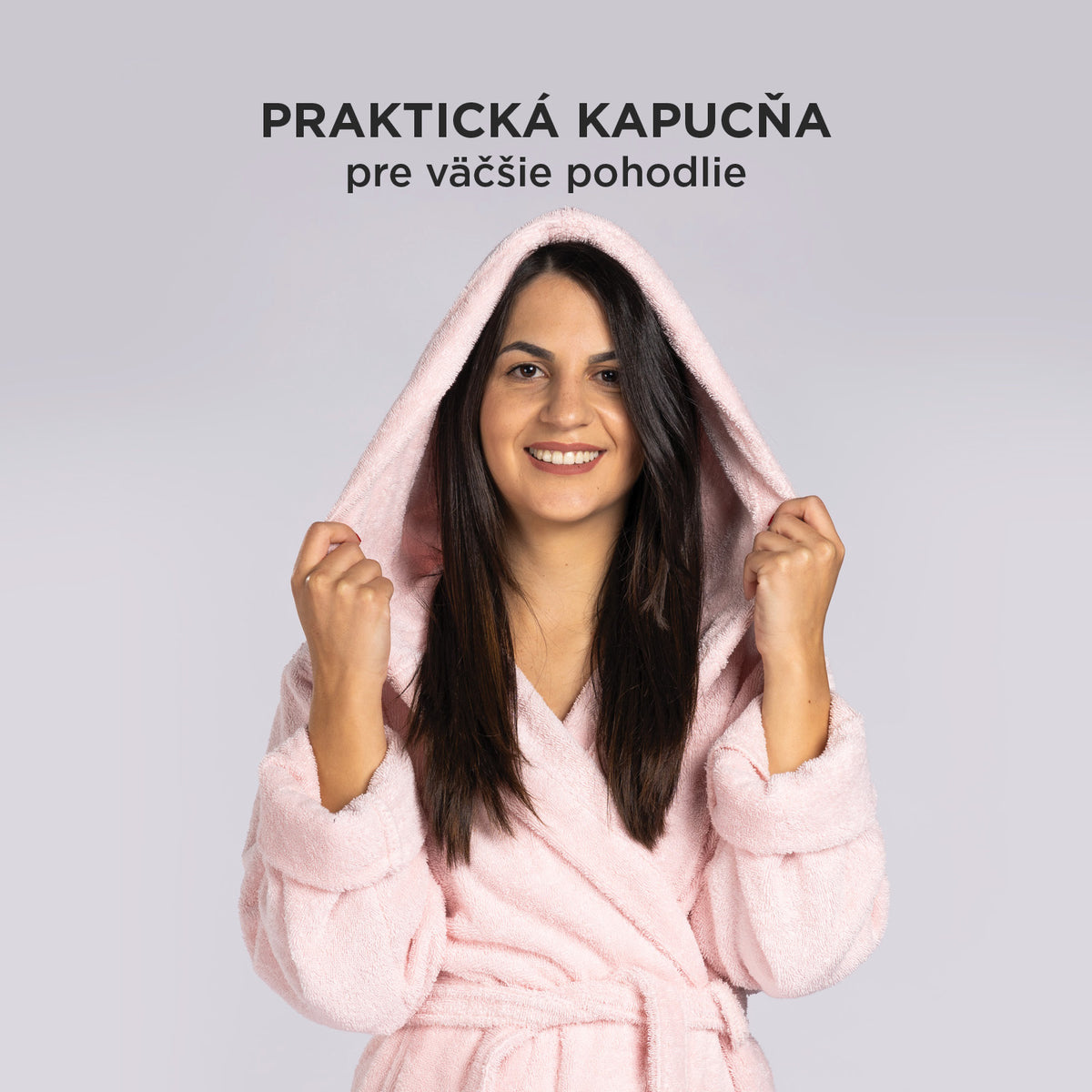 Župan má praktickú kapucňu, ktorá zakryje mokré vlasy a ochráni ich pred chladom. Dve veľké našité vrecká sú ideálne na ohriatie rúk alebo uloženie drobných nevyhnutností, ktoré potrebujete mať vždy poruke.